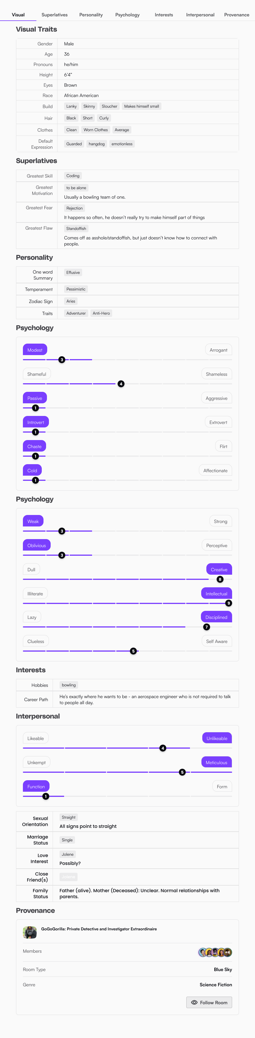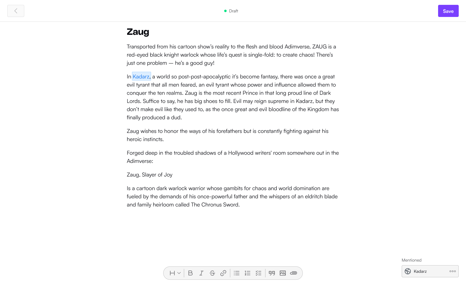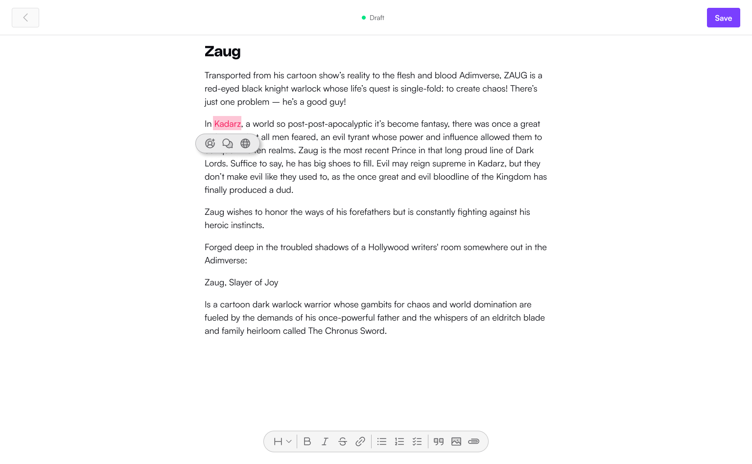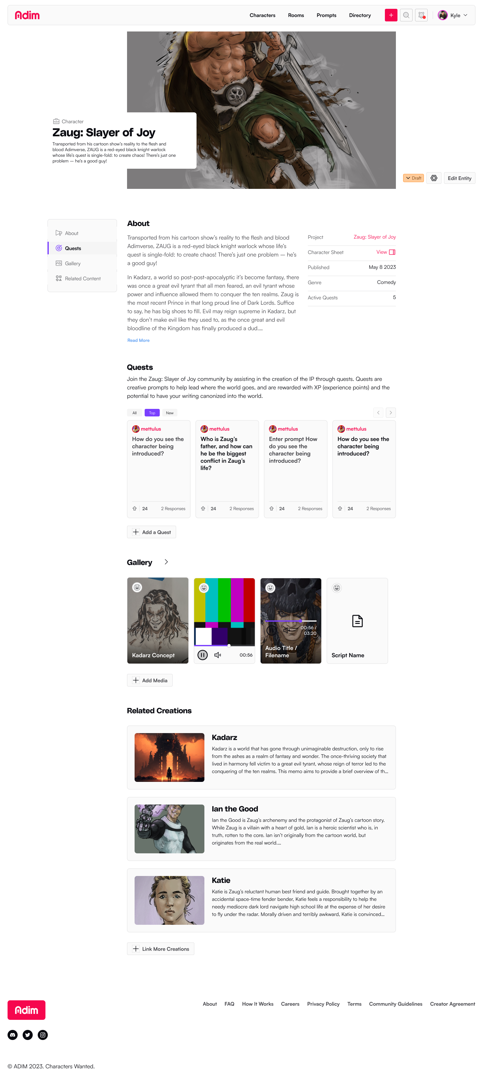 Another tentpole object are characters and worlds or entities. These are a large part of the creation, and can be used to explore deeply the object's whole story. Imagine a character sheet from a tabletop game, with the added interactivity of prompting, and maybe some day an ai driven chat.