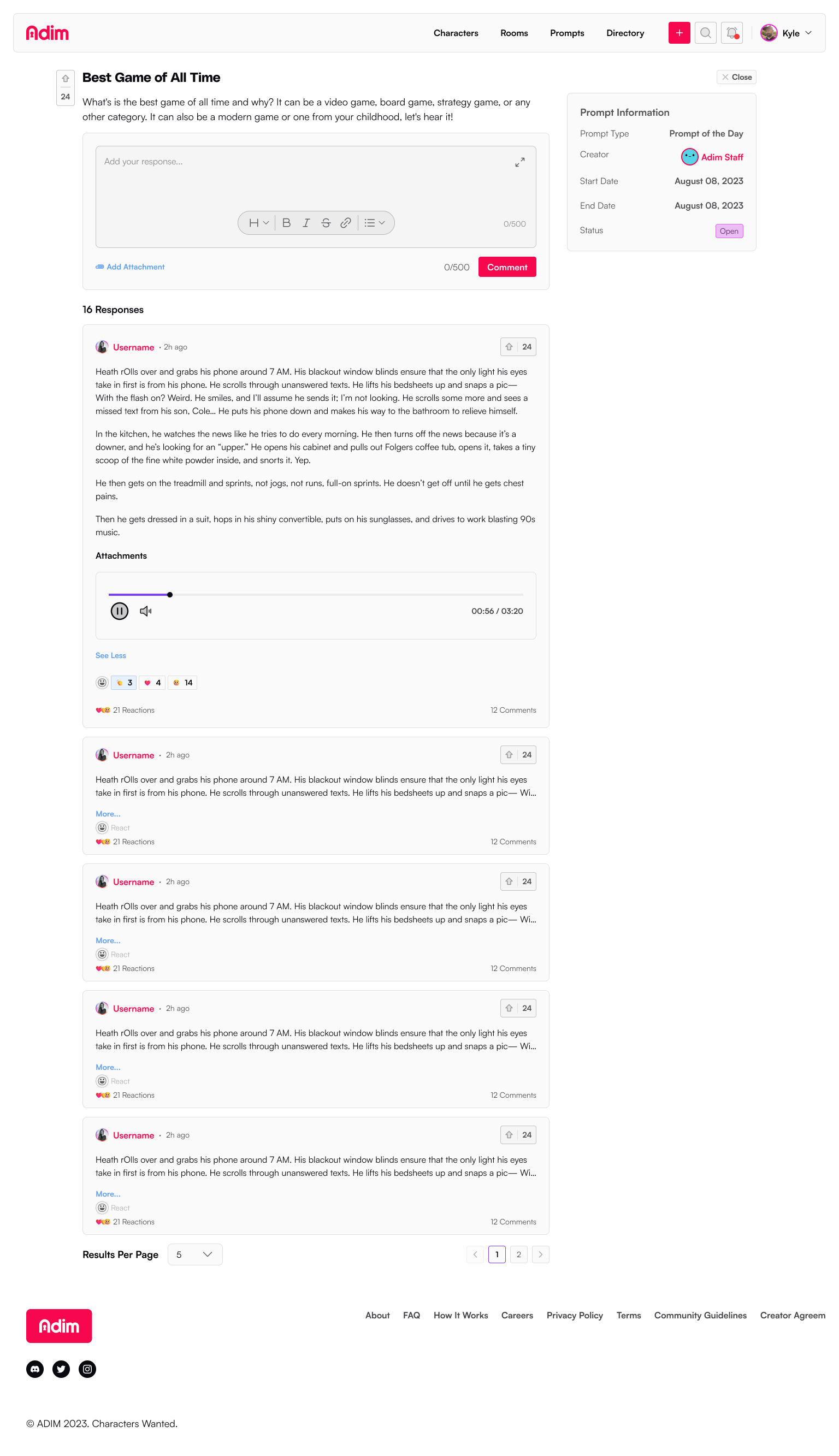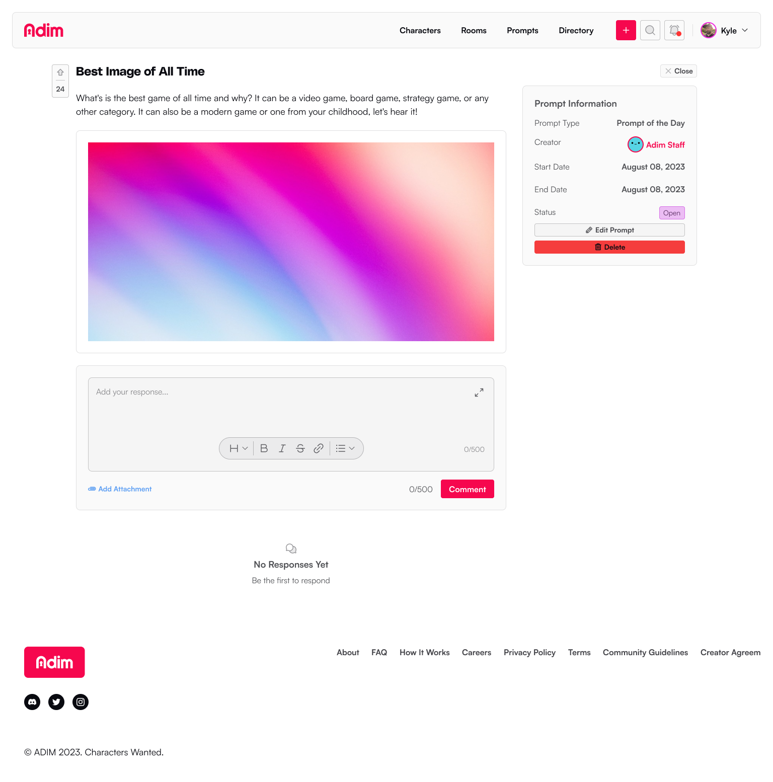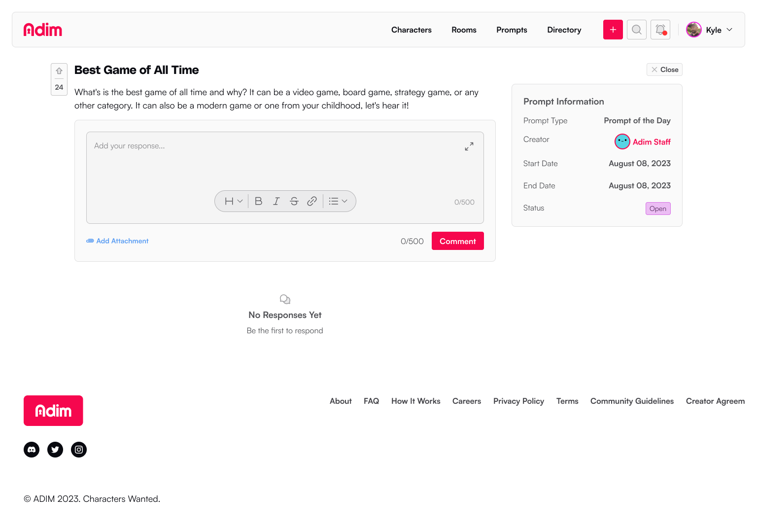 Prompts are response mechanisms a creator can use to collaborate with their room members or send to the greater community to help them create more rich, vibrant stories, or develop a character or world.