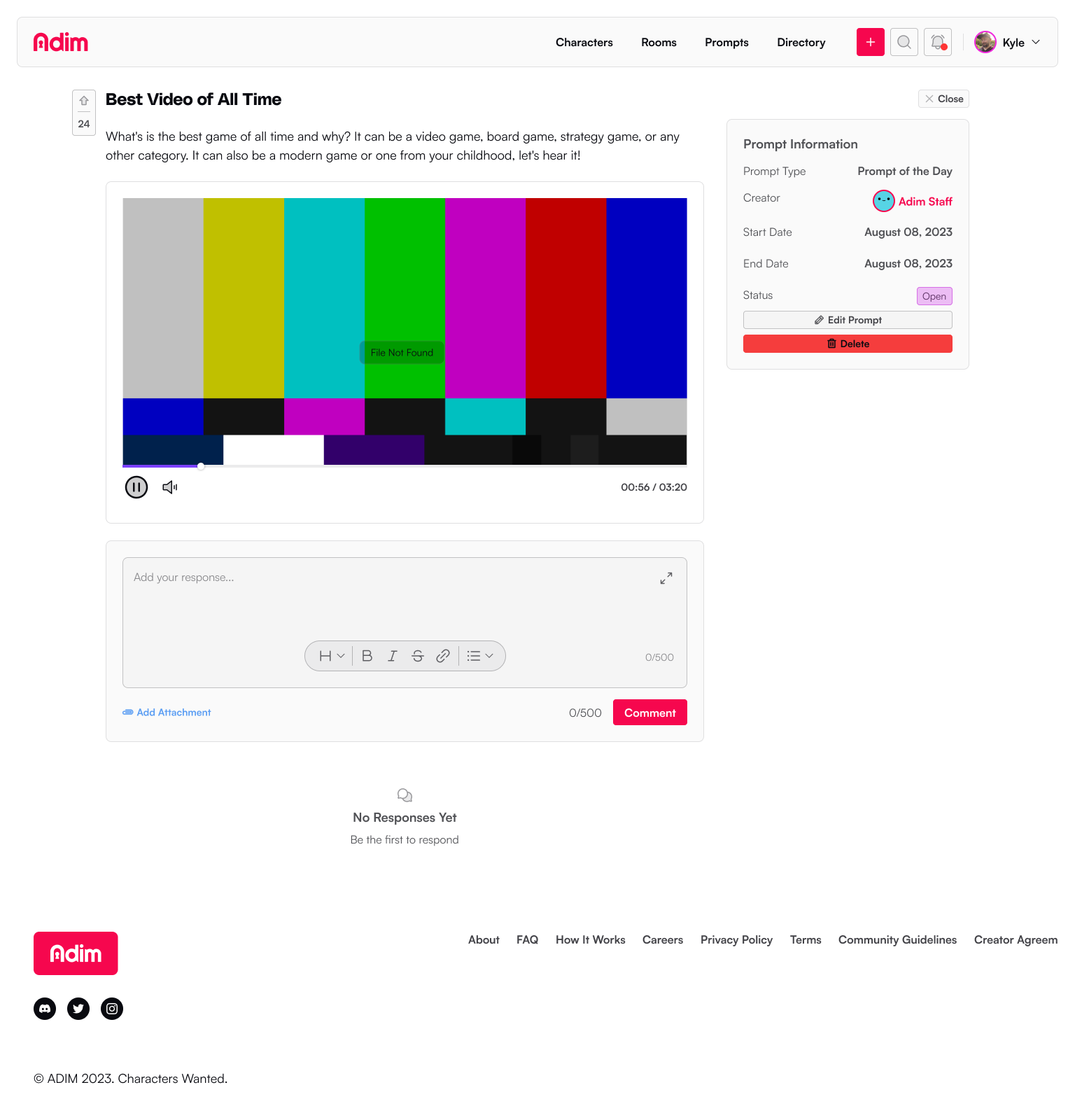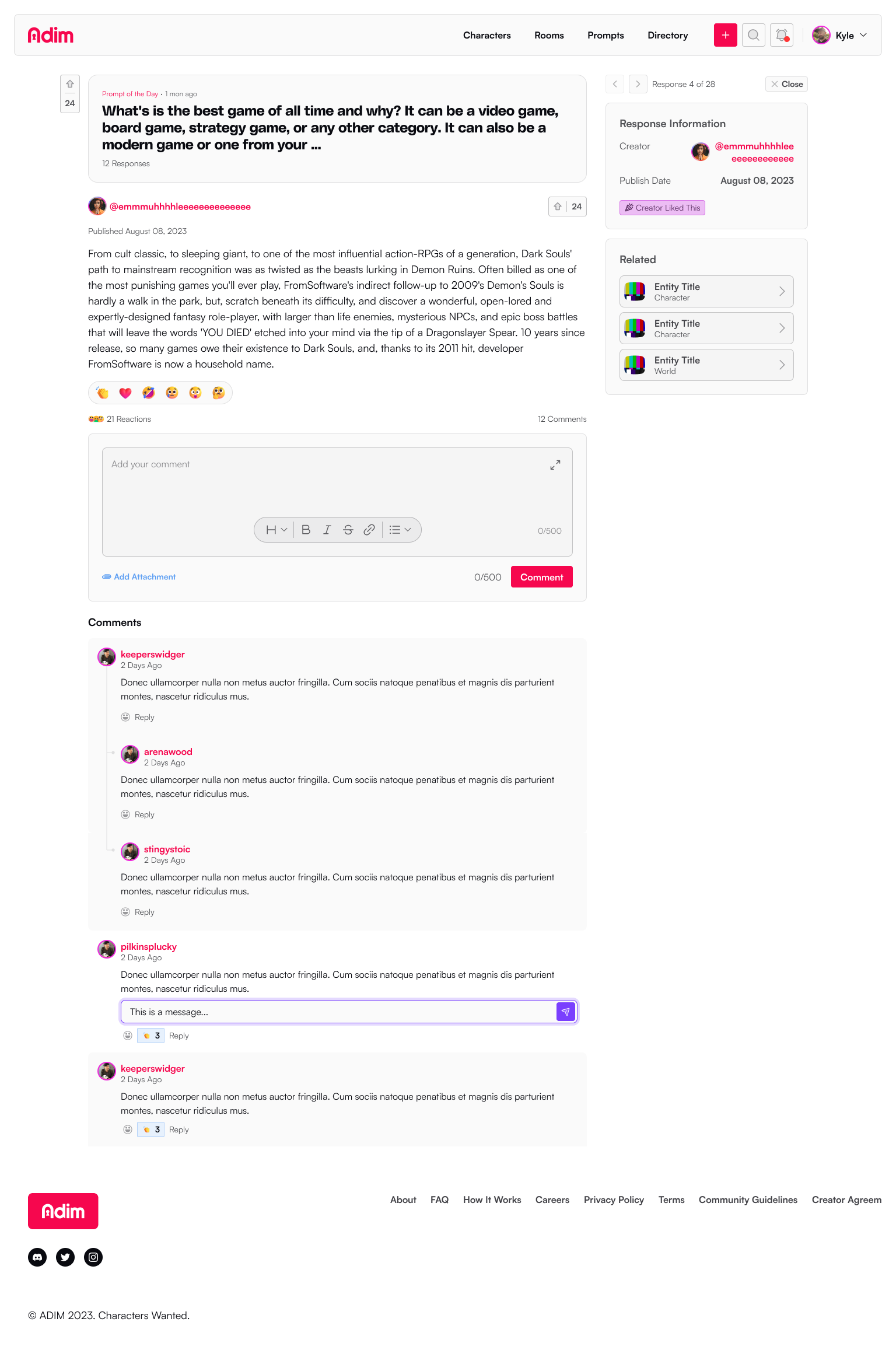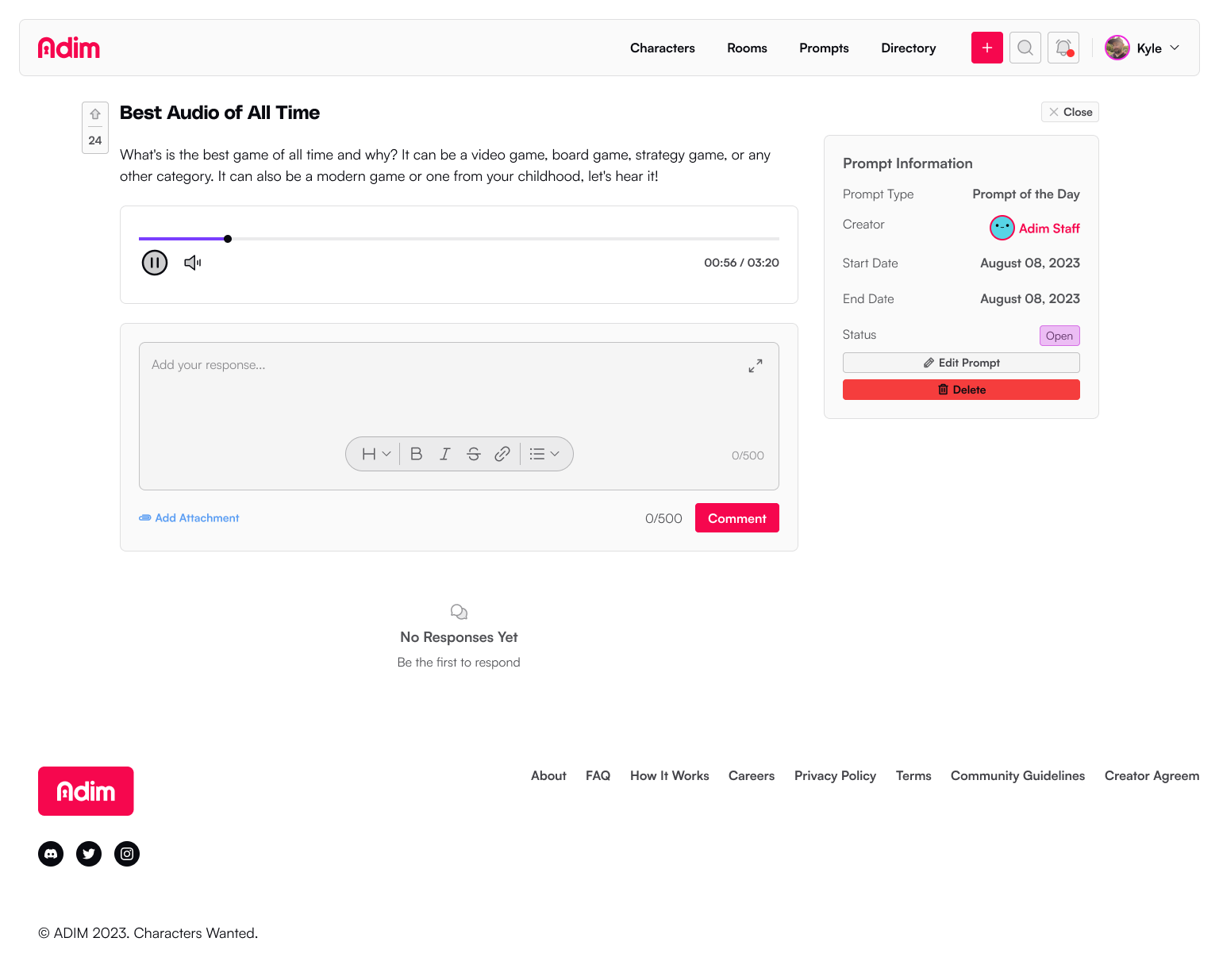 Prompts are response mechanisms a creator can use to collaborate with their room members or send to the greater community to help them create more rich, vibrant stories, or develop a character or world.