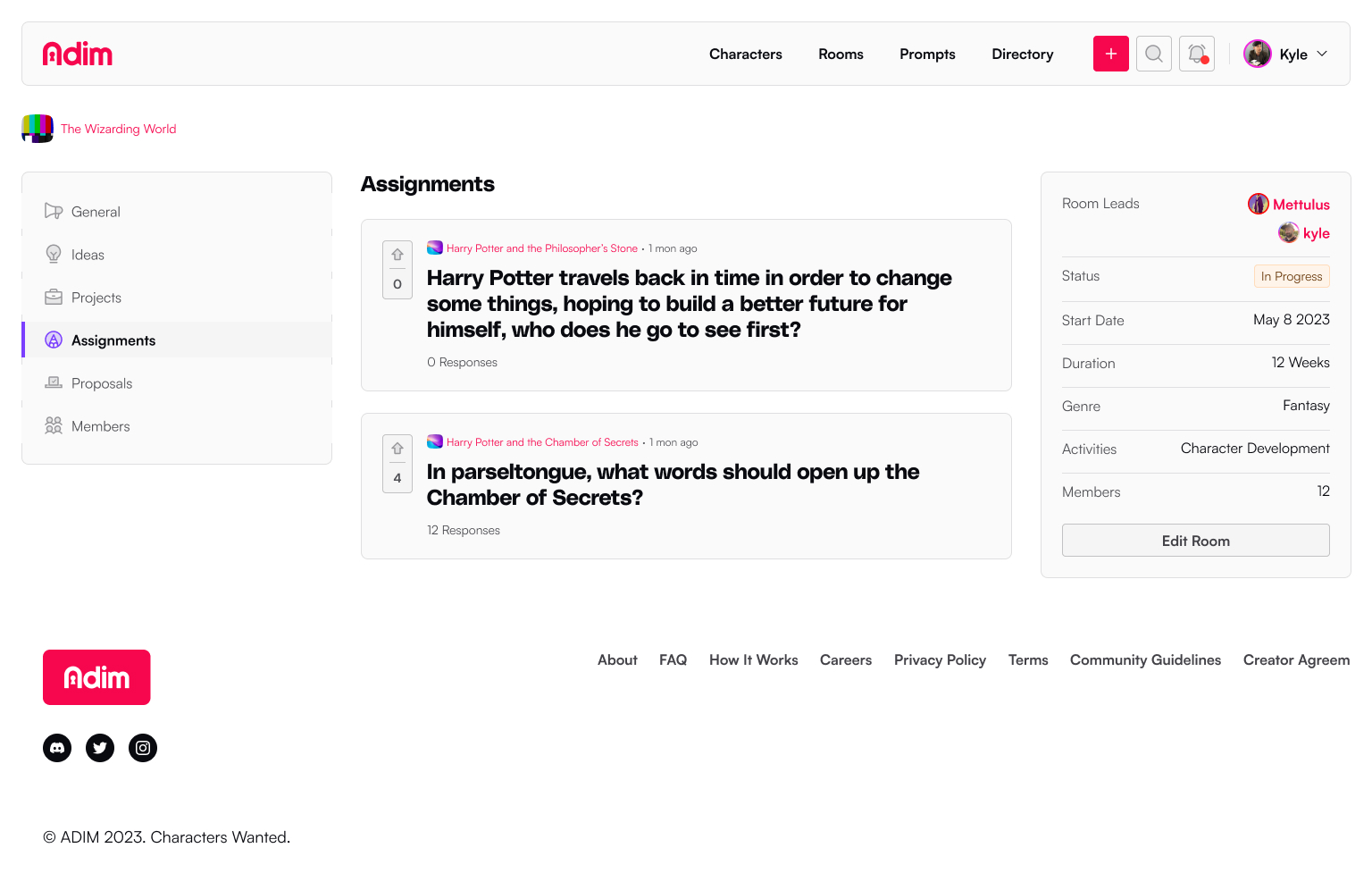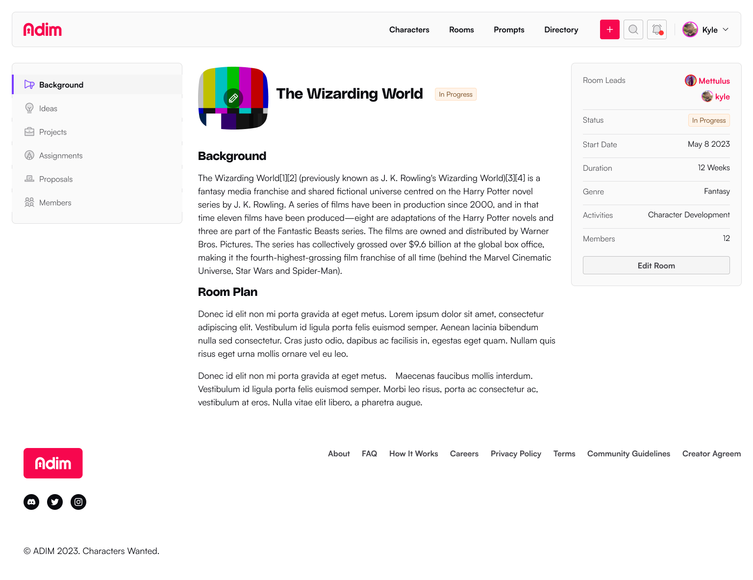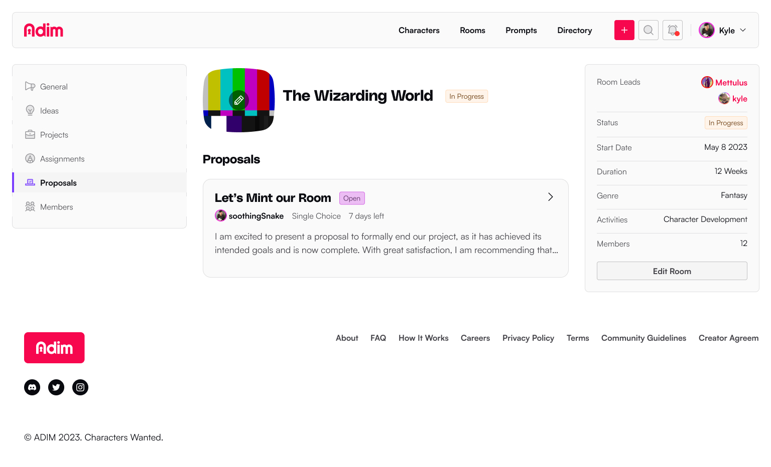 Writing Rooms are solo or collaborative spaces to create characters, worlds, and stories on the Adim platform. It's here that users have access to setting up their project to support other members, new ideas, create assignments, propose changes, and manage membership.