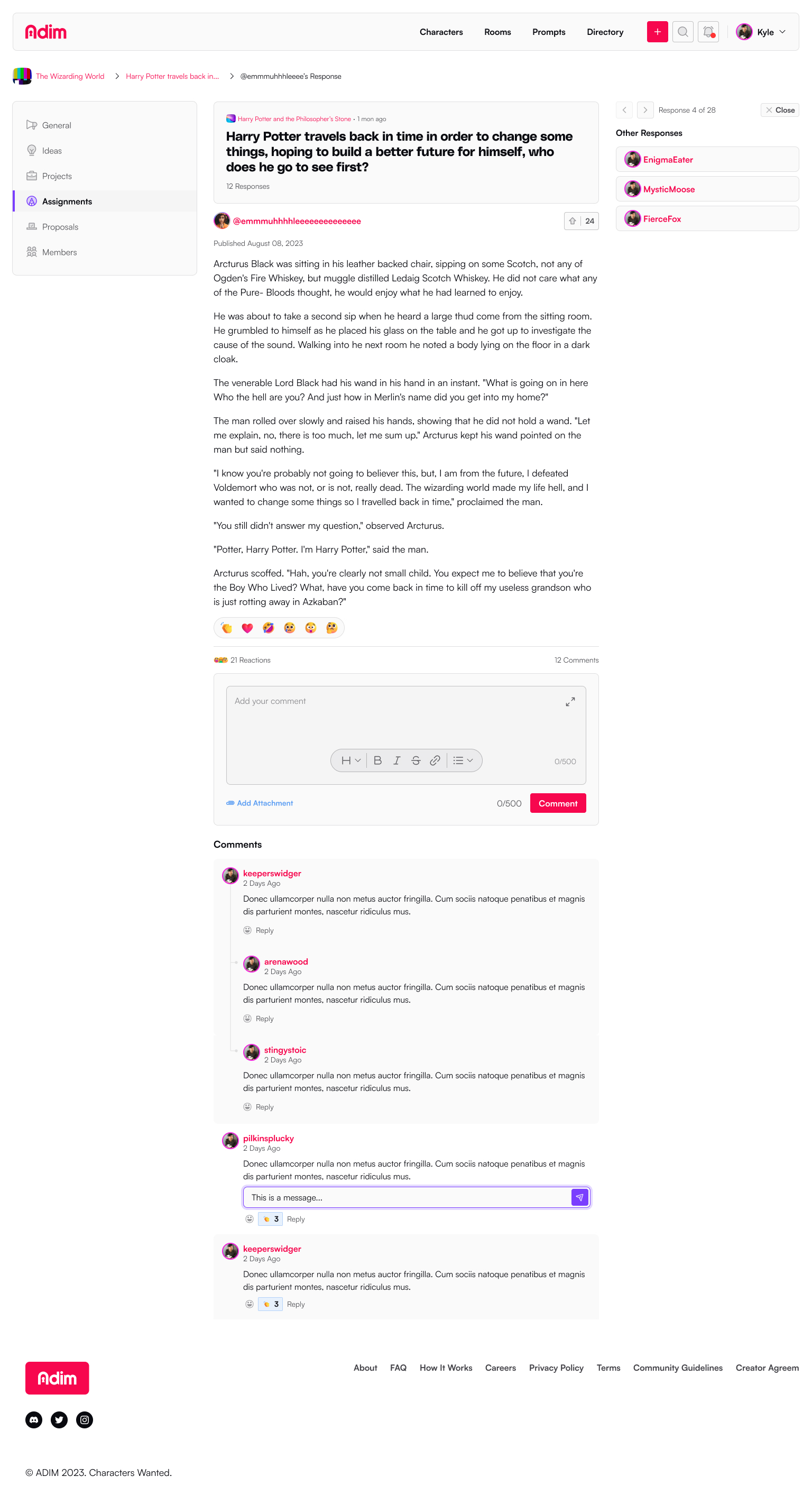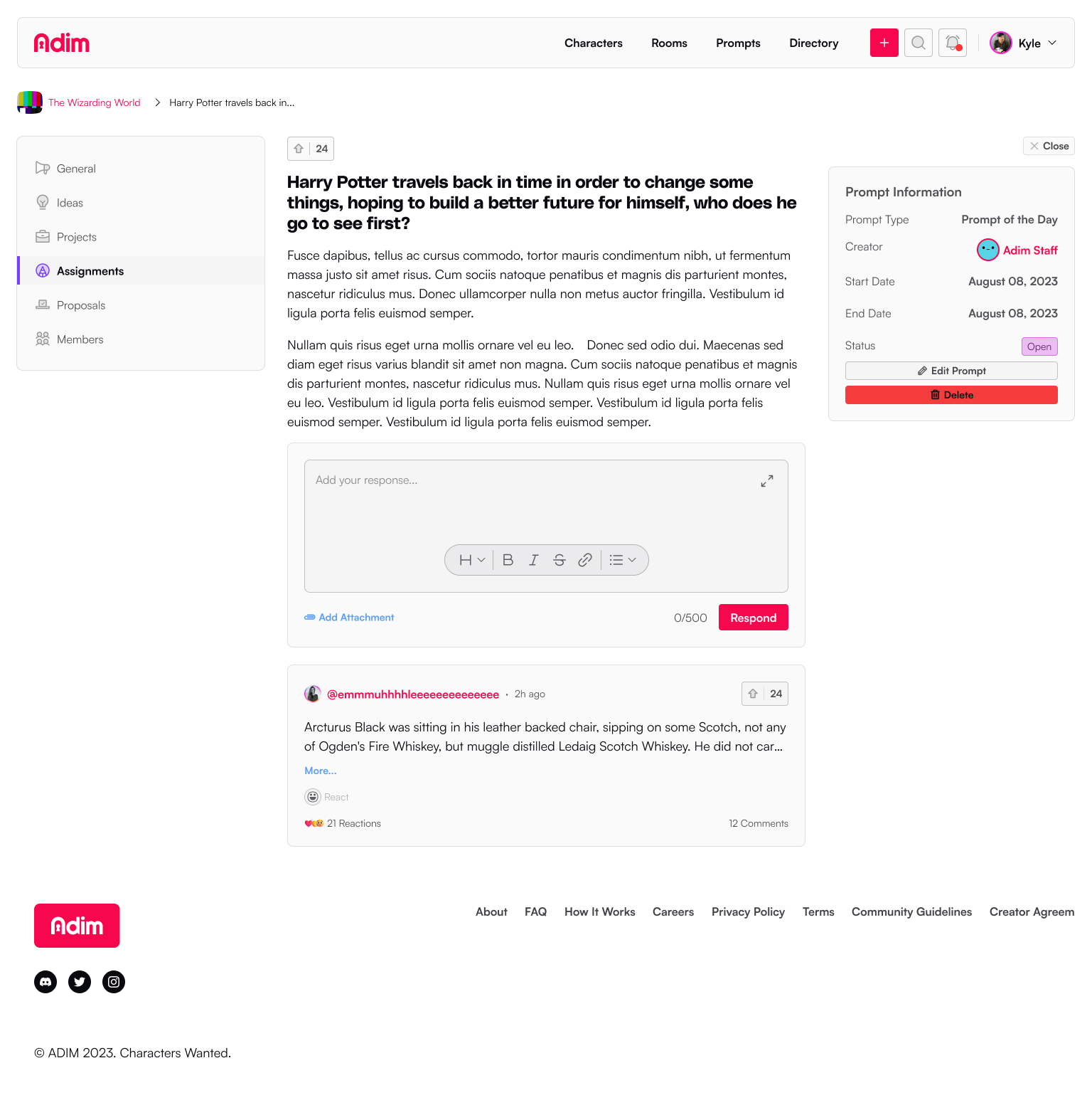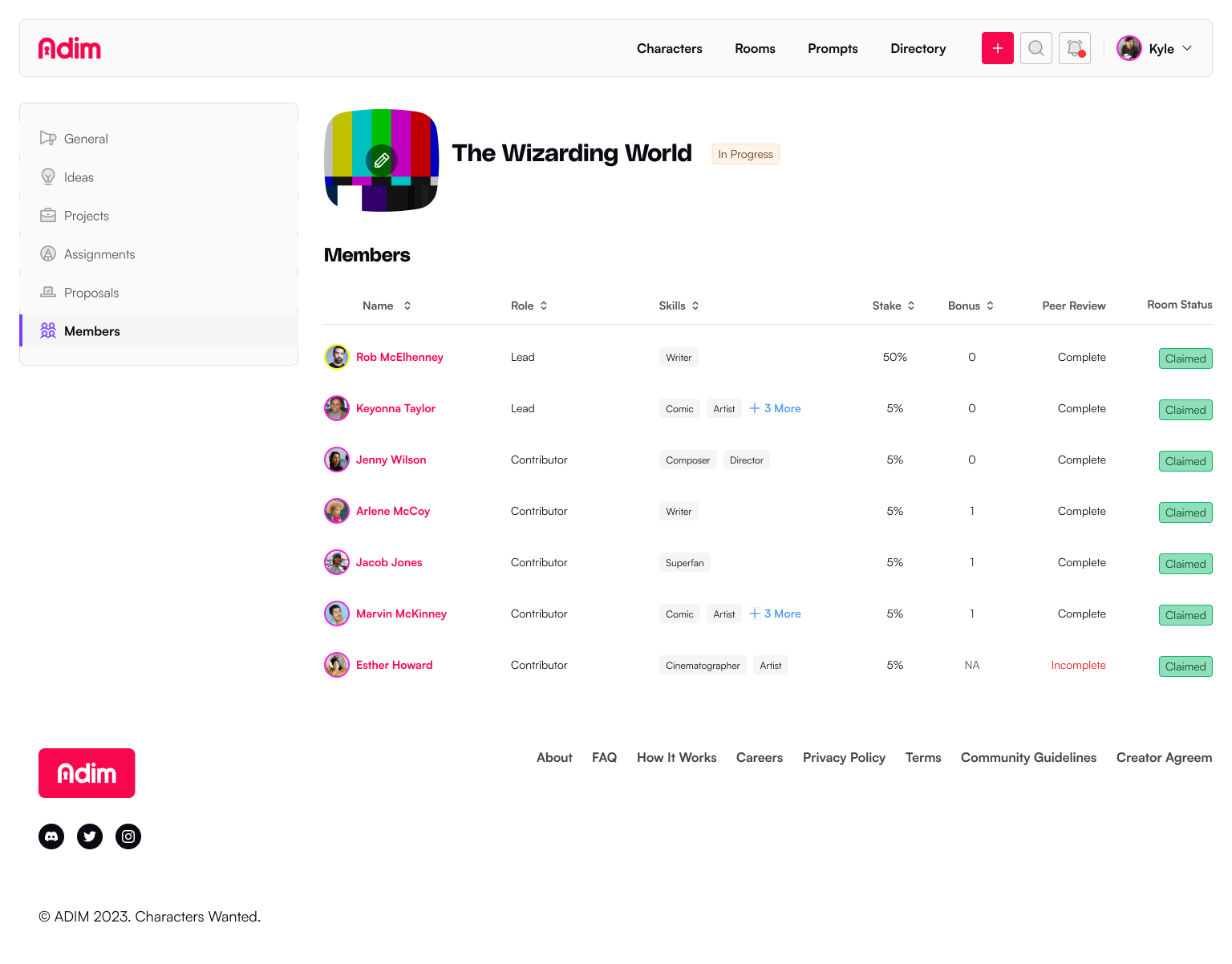 Writing Rooms are solo or collaborative spaces to create characters, worlds, and stories on the Adim platform. It's here that users have access to setting up their project to support other members, new ideas, create assignments, propose changes, and manage membership.